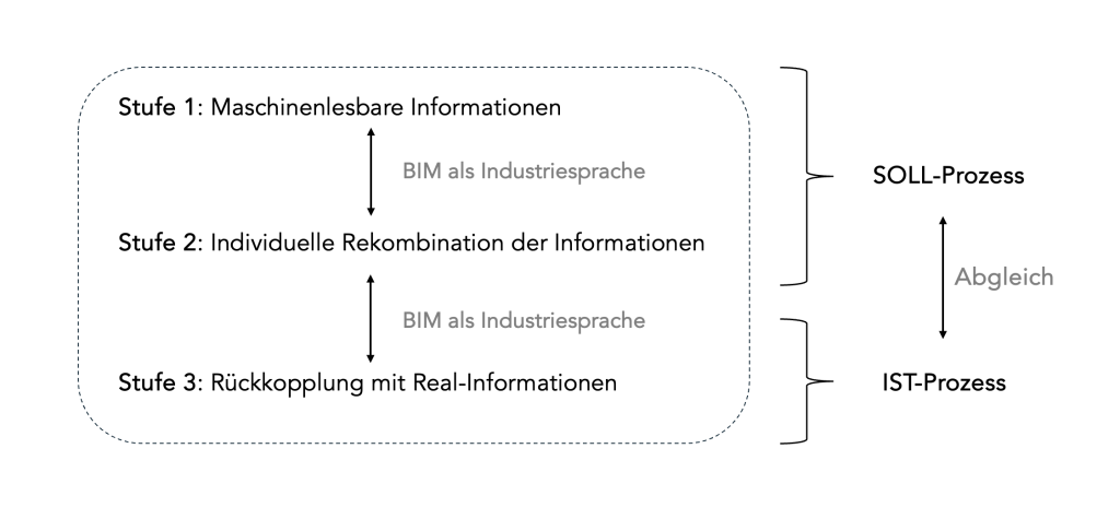 In der dritten Stufe der Digitalisierung erfolgt die Rückkopplung mit der Realität. Die ersten beiden Stufen haben die Besonderheit, dass es sich dabei nur um Prognosen in der Zukunft oder Simulationen handelt. Die Realität findet jedoch in der Ausführung statt, also alles was in den Fabriken der Verfertigung oder auf den Baustellen stattfindet.